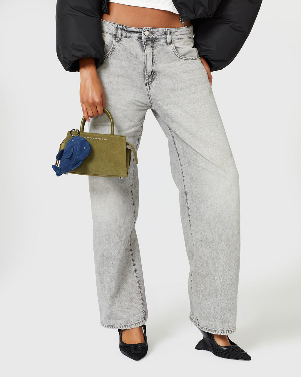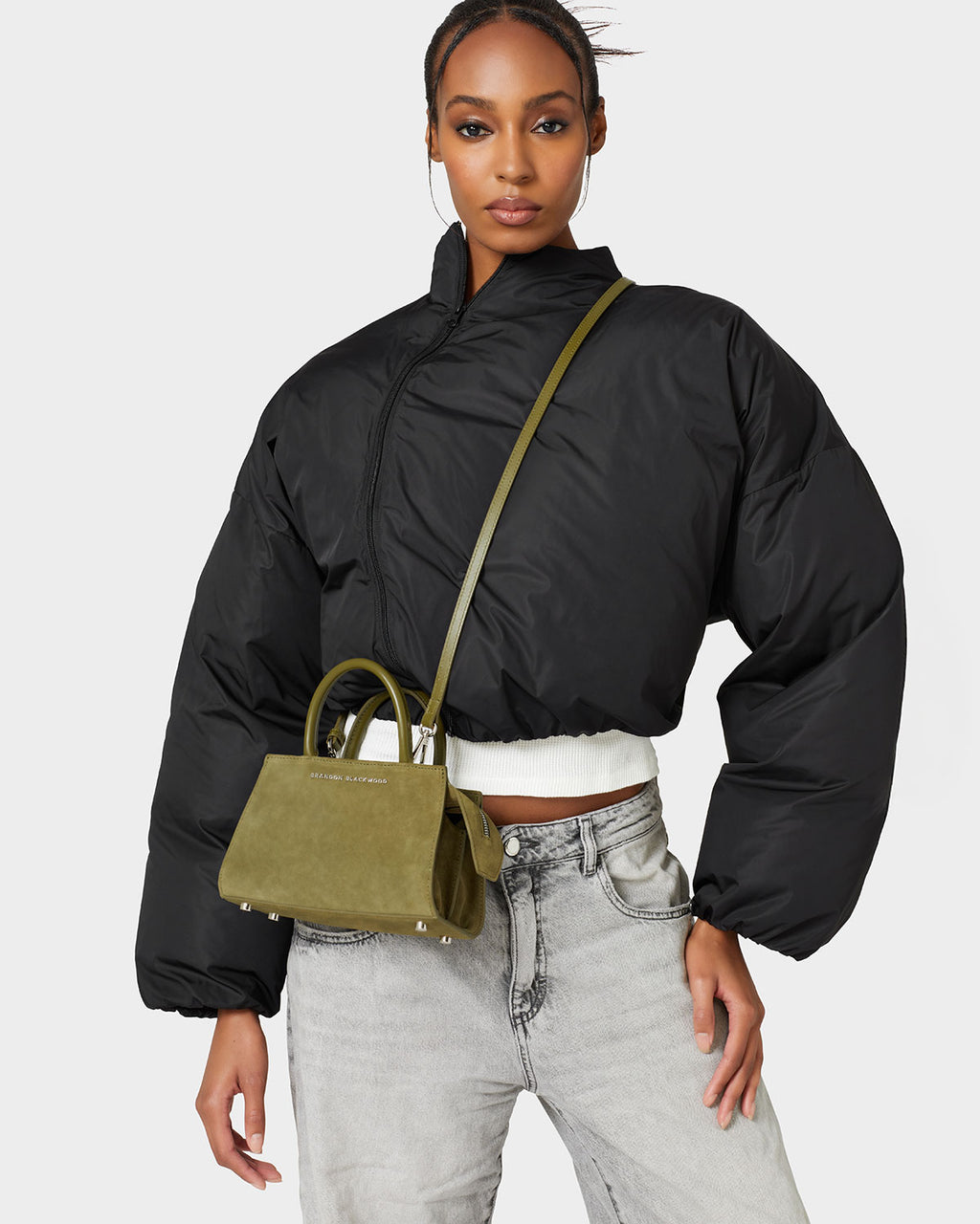 Our Arlen Bag in Dark Green Suede, Featuring an Exaggerated Zipper Detail