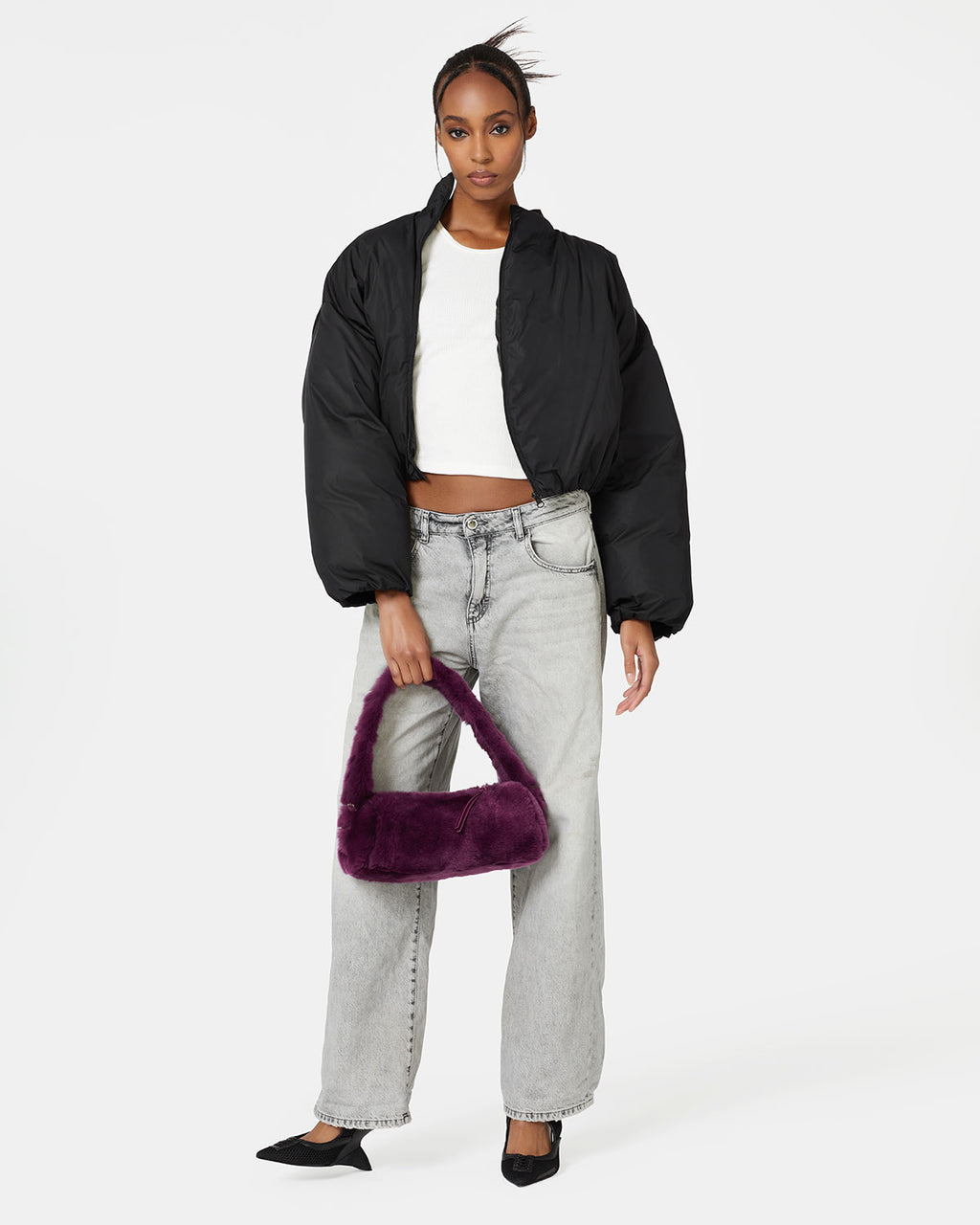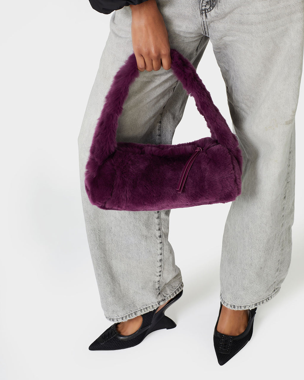 Our Chloe Bag in Eggplant Rabbit Fur with Silver Hardware
