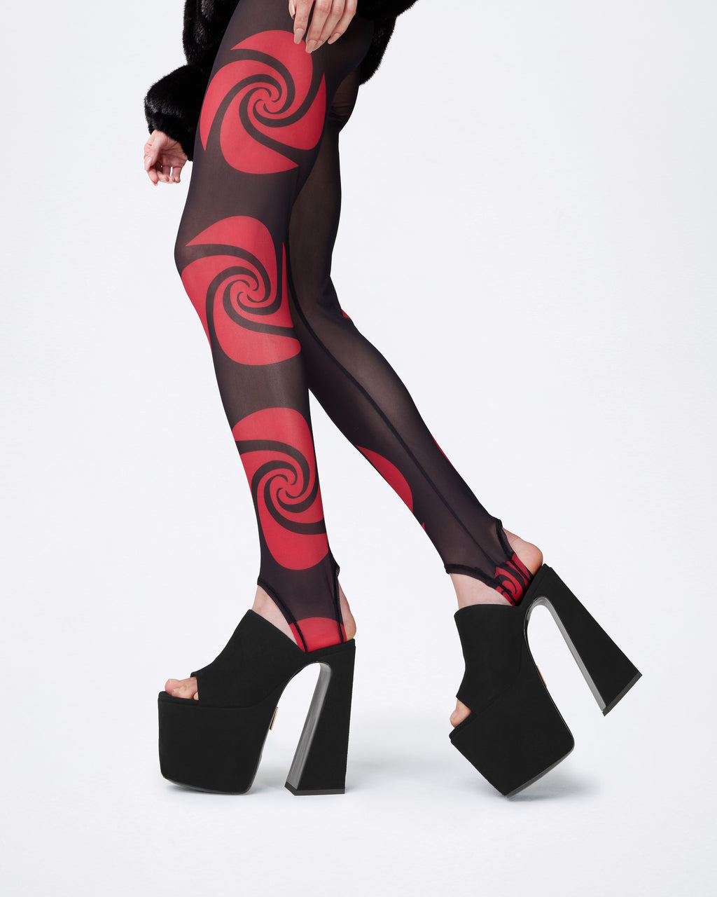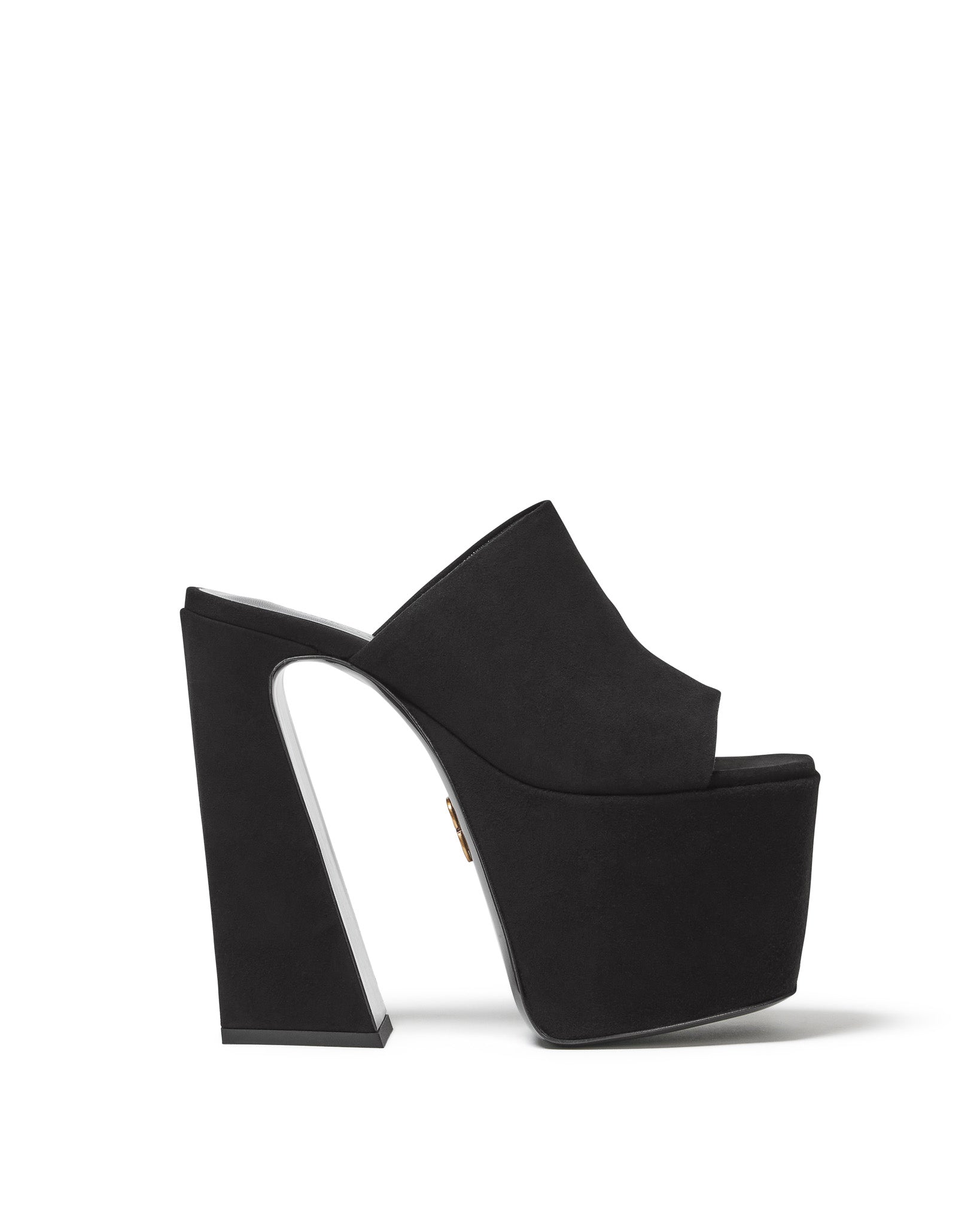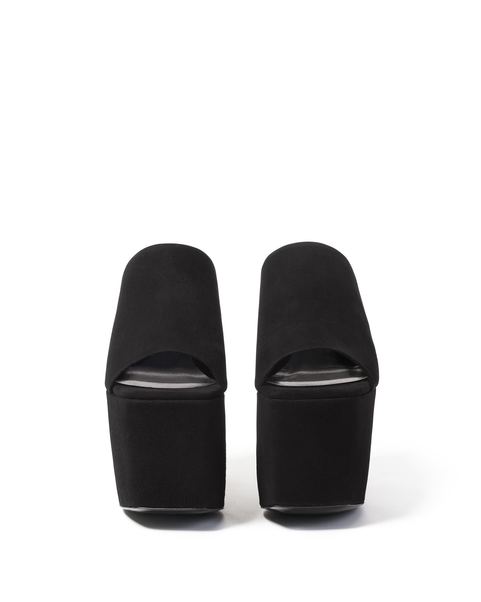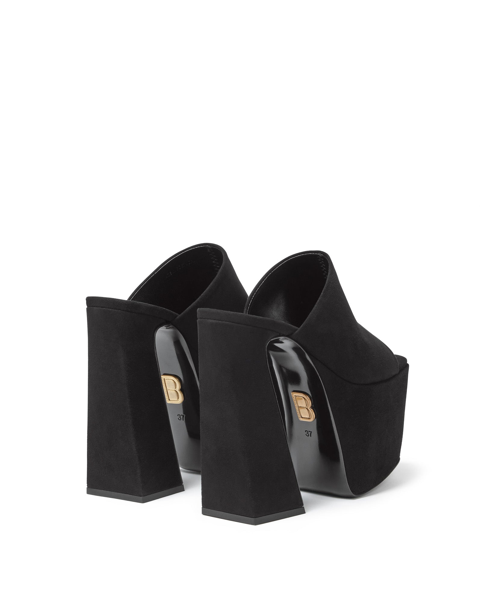 Our Harlo Platform Mule in Black Suede with Signature B Logo