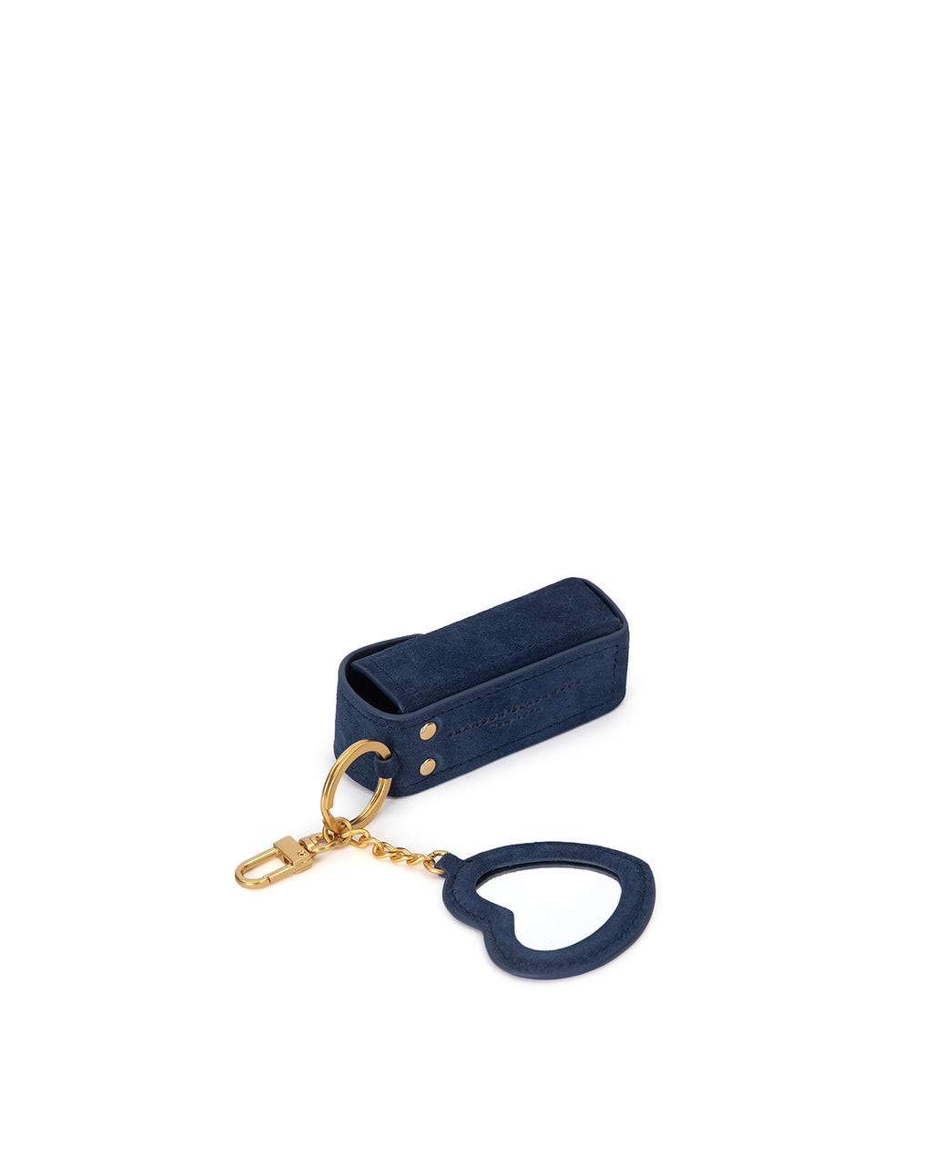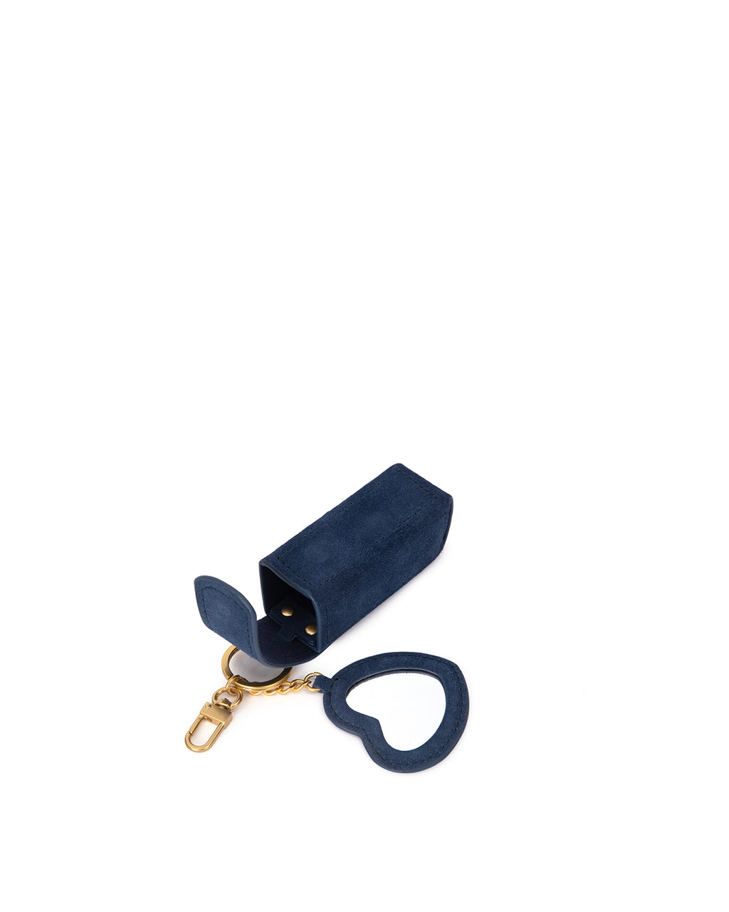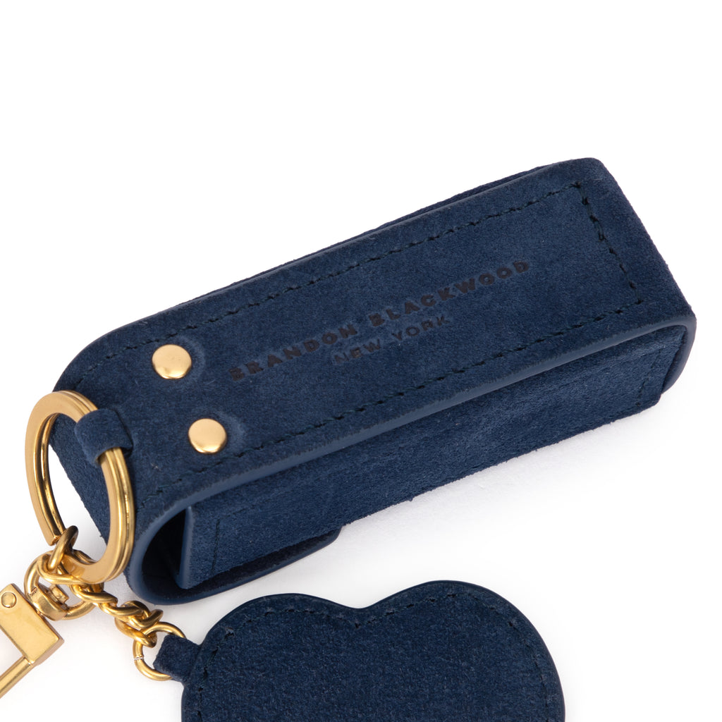 Soft texture meets refined design. The Lipstick Case Bag Charm in Blue Suede is crafted from rich, velvety suede and finished with polished brass hardware. Designed to hold a single lipstick or gloss, it adds a touch of understated luxury to any bag or keychain.