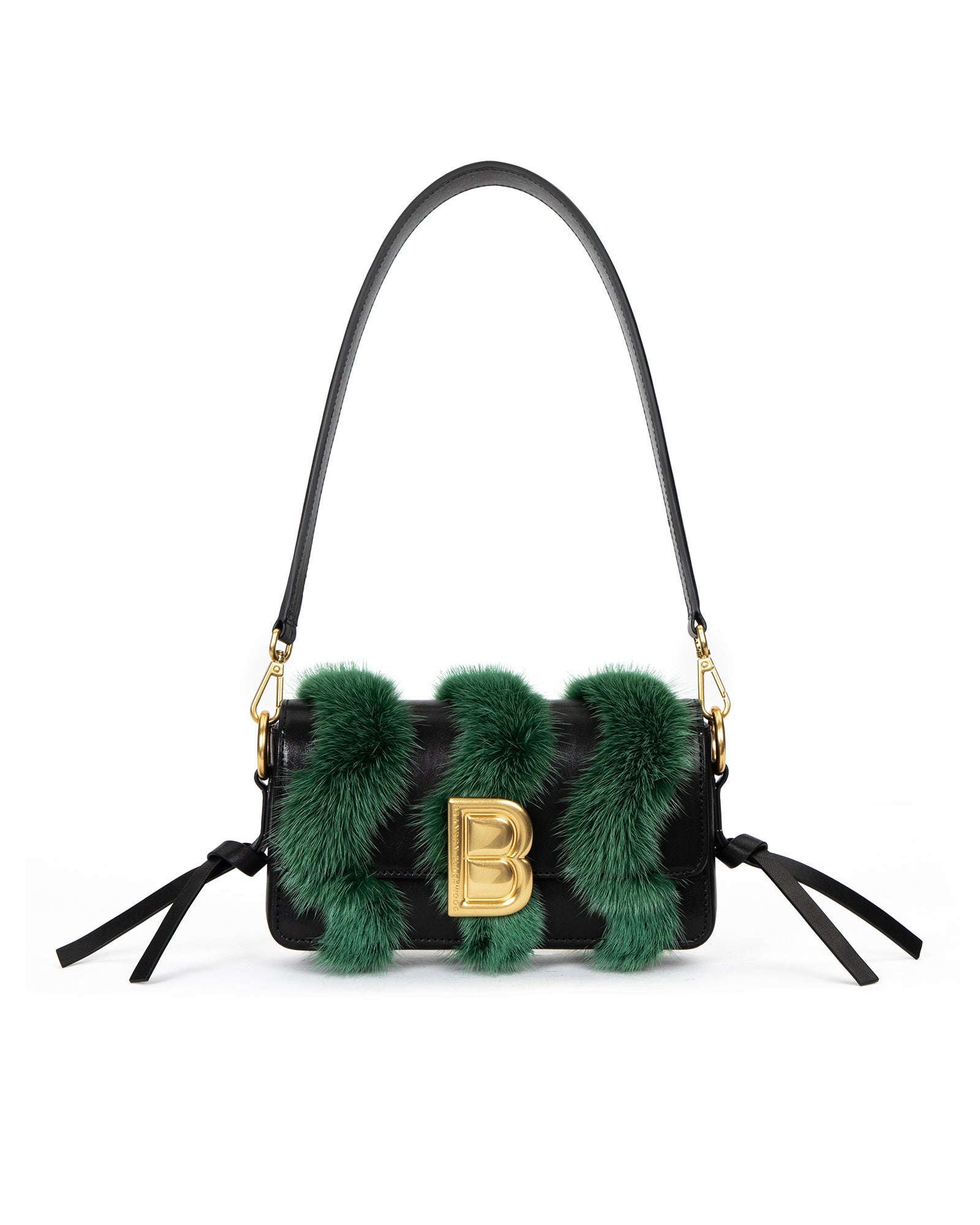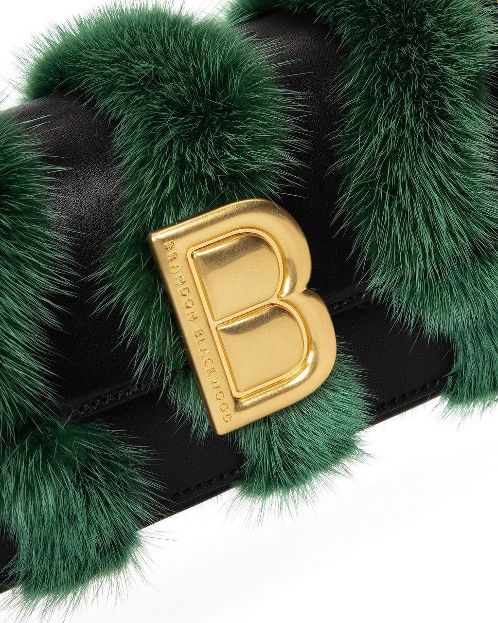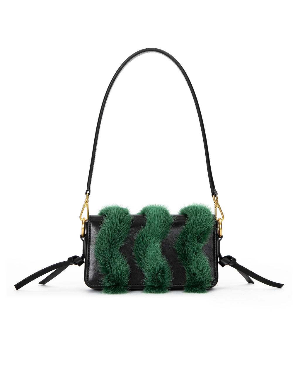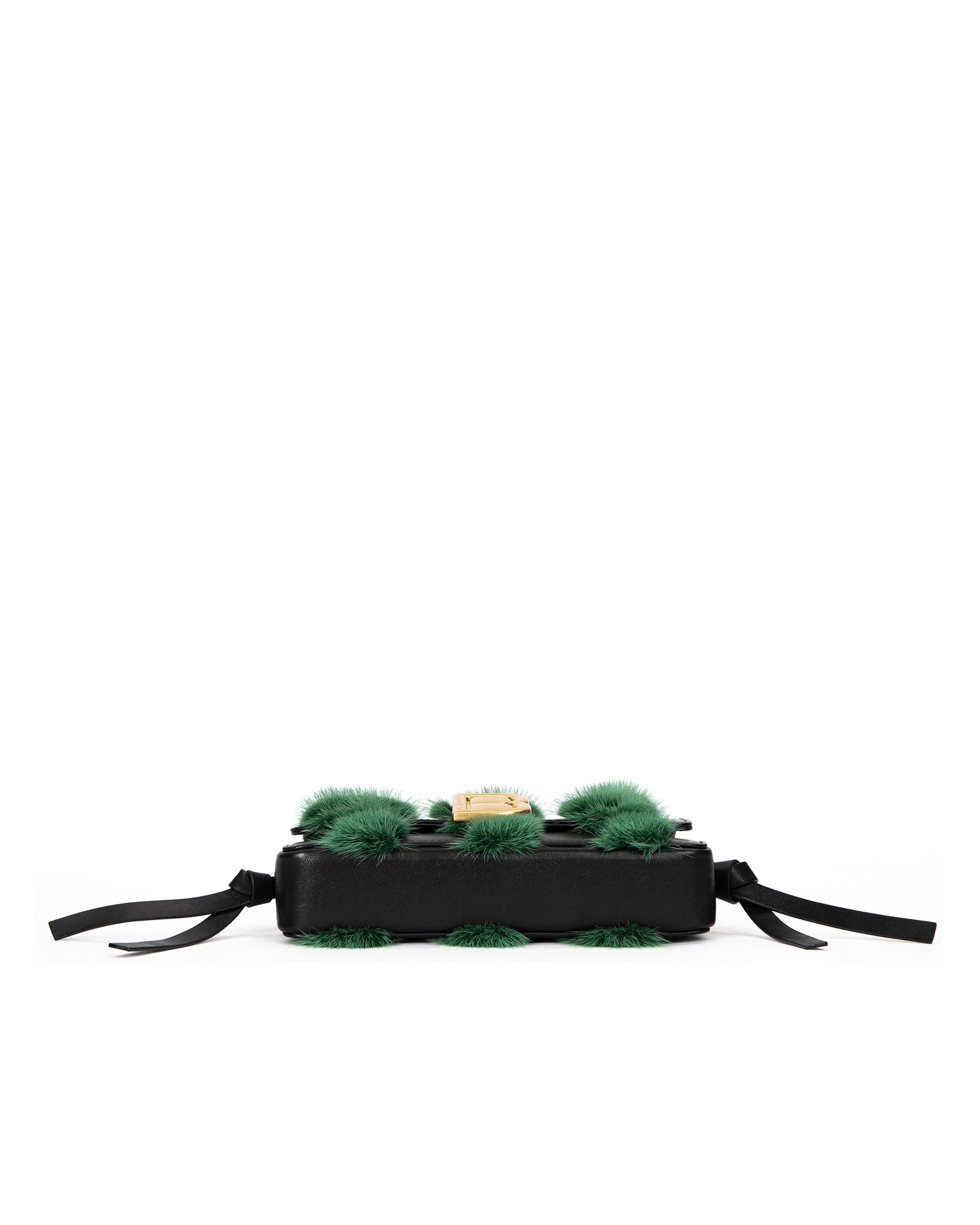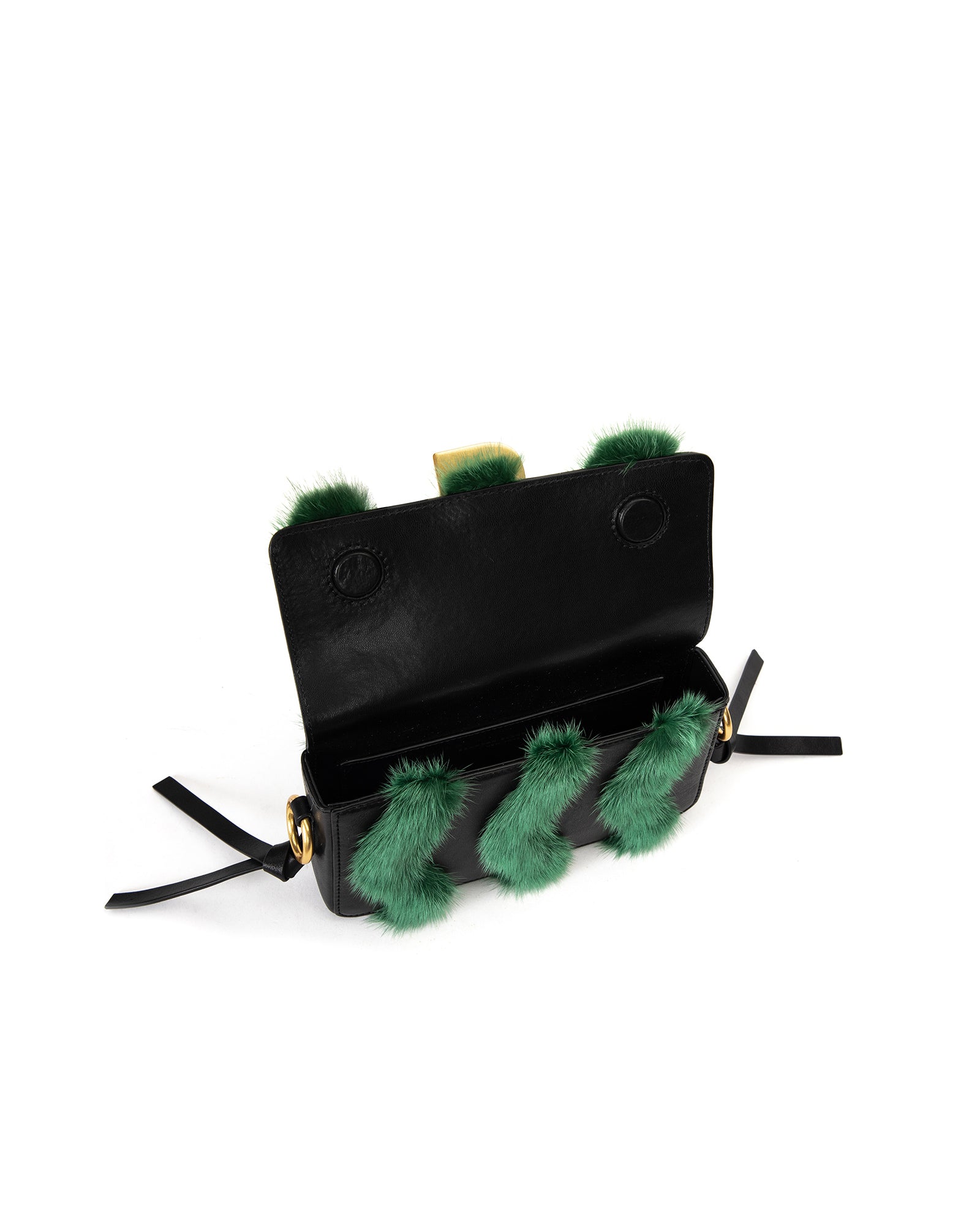 Our Medium Nia Bag in Black Hard Leather with Green Mink Fur