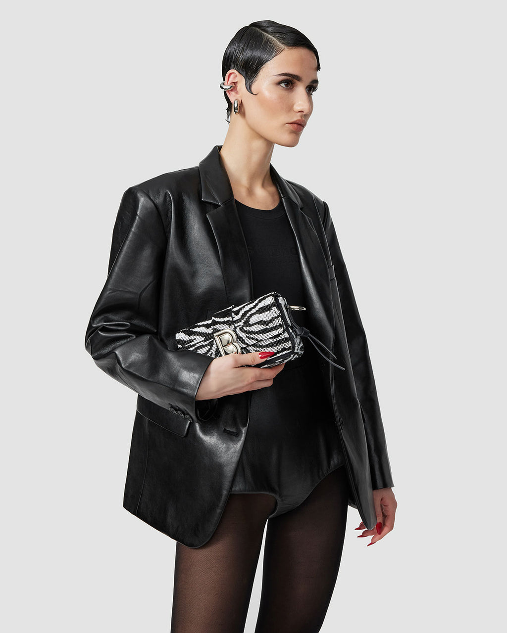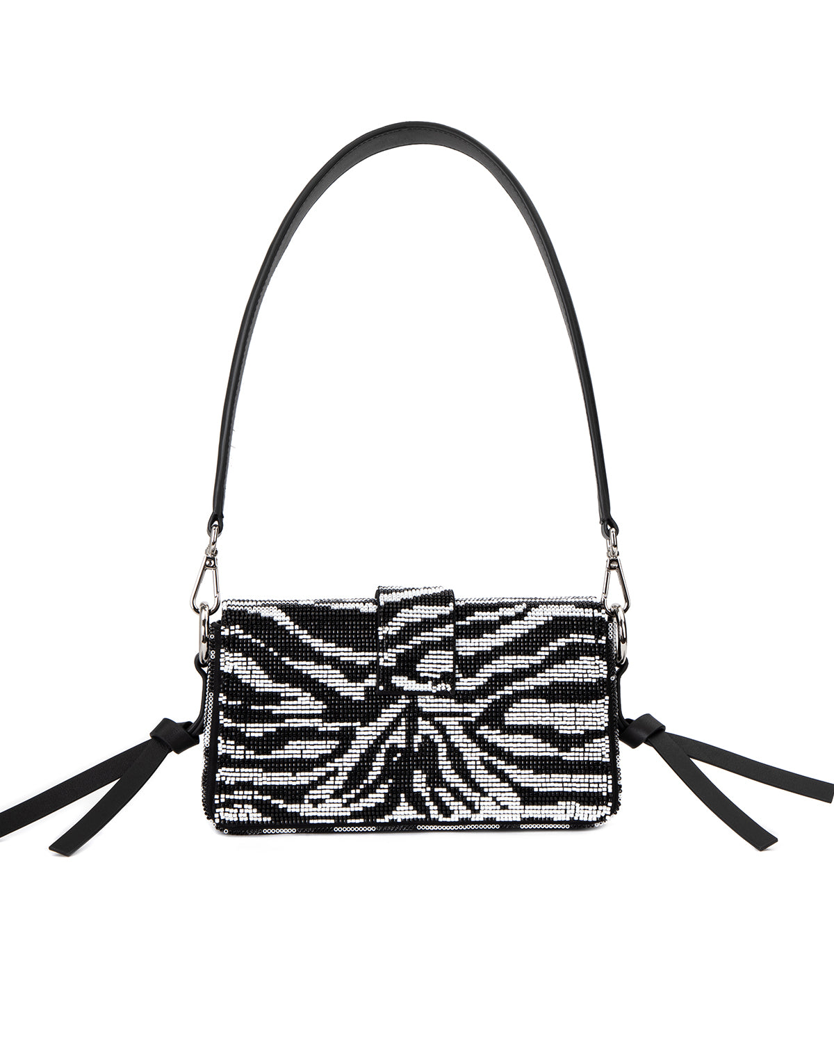 The Medium Nia Bag makes an entrance in bold zebra print with intricate beading that adds a touch of unexpected glamour. Designed for versatility, it can be worn as a shoulder bag for daytime ease or adjusted to a crossbody for evenings on the move. Striking yet functional, this statement piece transitions seamlessly from denim to cocktail dresses, keeping essentials close while delivering undeniable style.