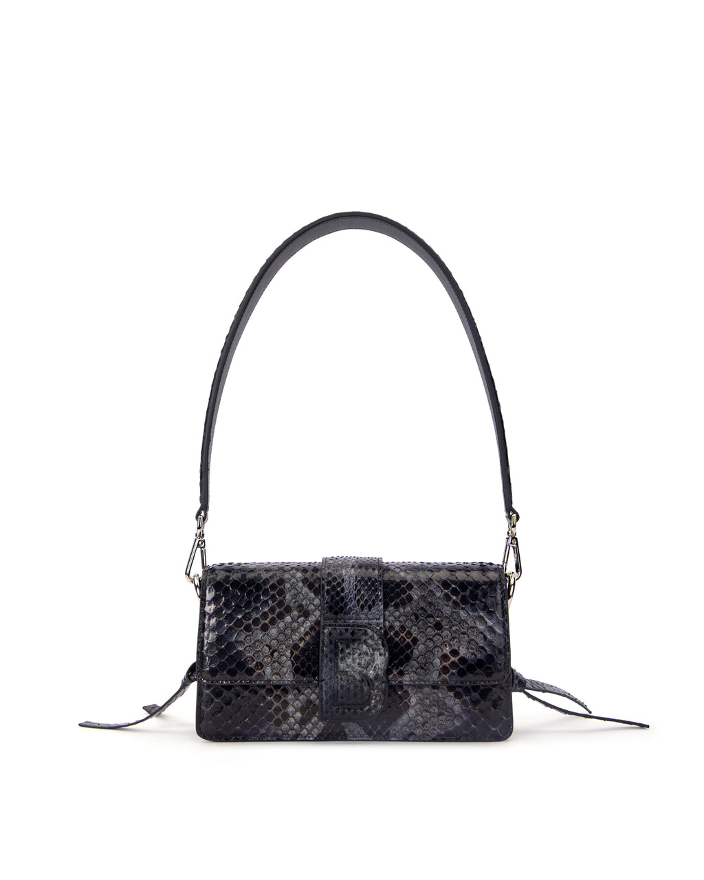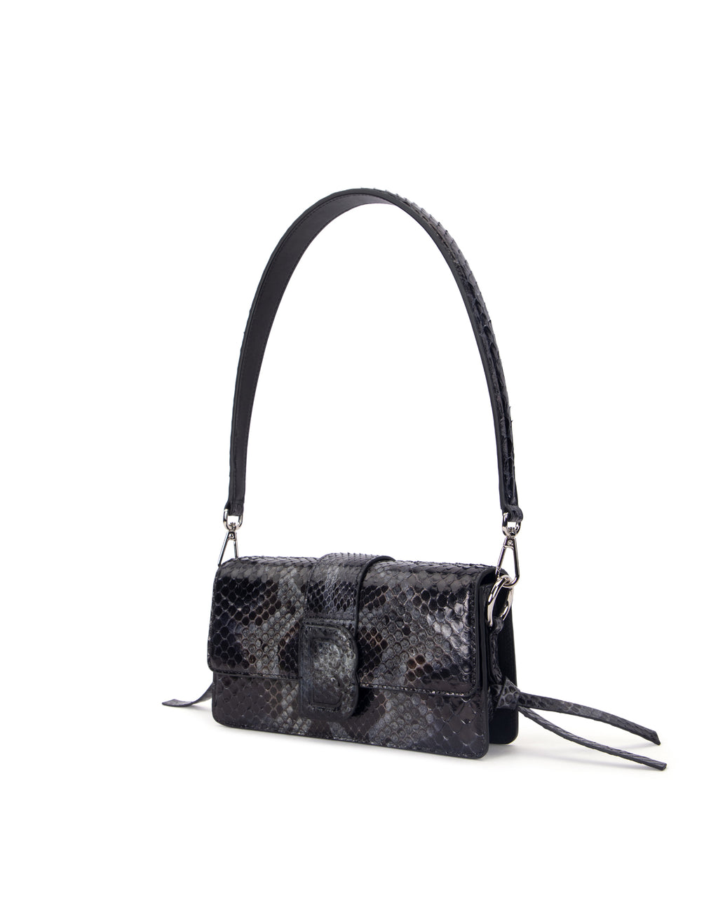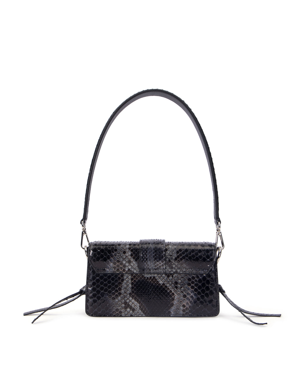 Our Medium Nia Bag in Black and Silver Snakeskin with Silver Hardware