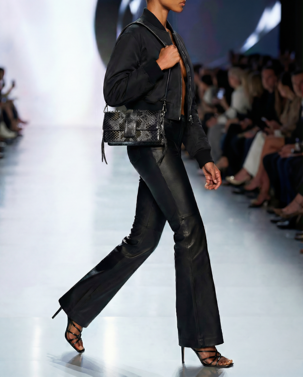 Turn heads with the Medium Nia Bag in black and silver snakeskin, polished silver hardware, and a soft microfiber lining. Each bag is made to order, crafted with care, and designed for those who love bold, distinctive accessories.
