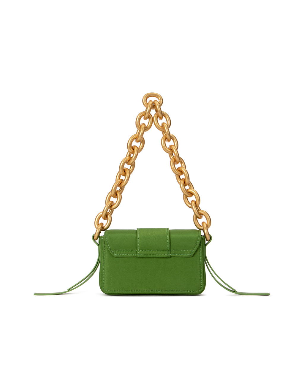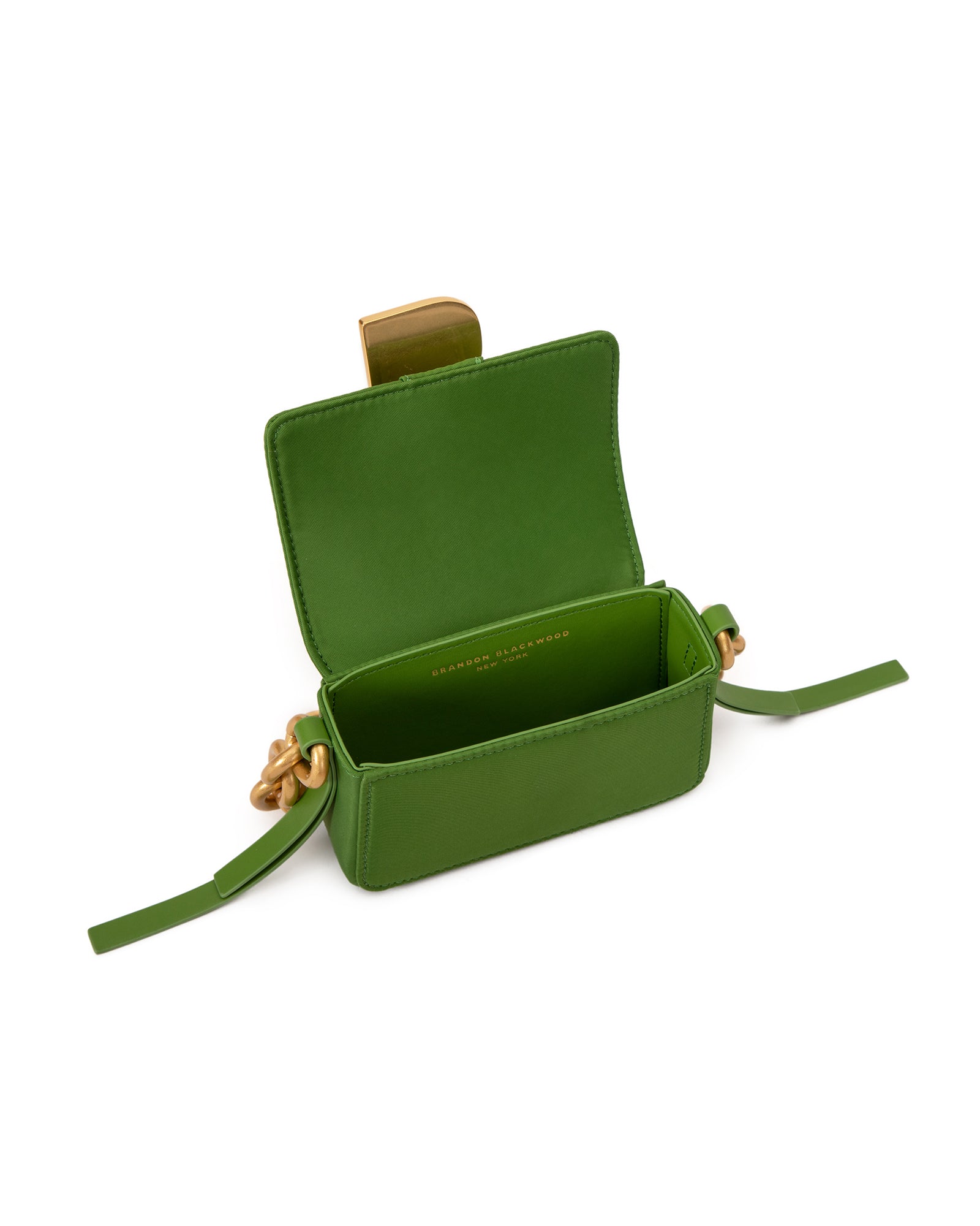The Micro Nia is the perfect everyday companion, blending fashion-forward flair with exceptional functionality. The vibrant green hue and polished brass hardware make a striking style statement. The perfect mini handbag to add to your collection.