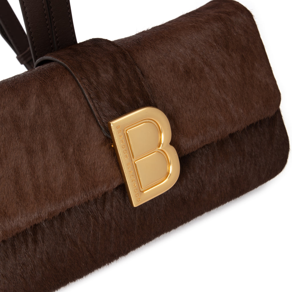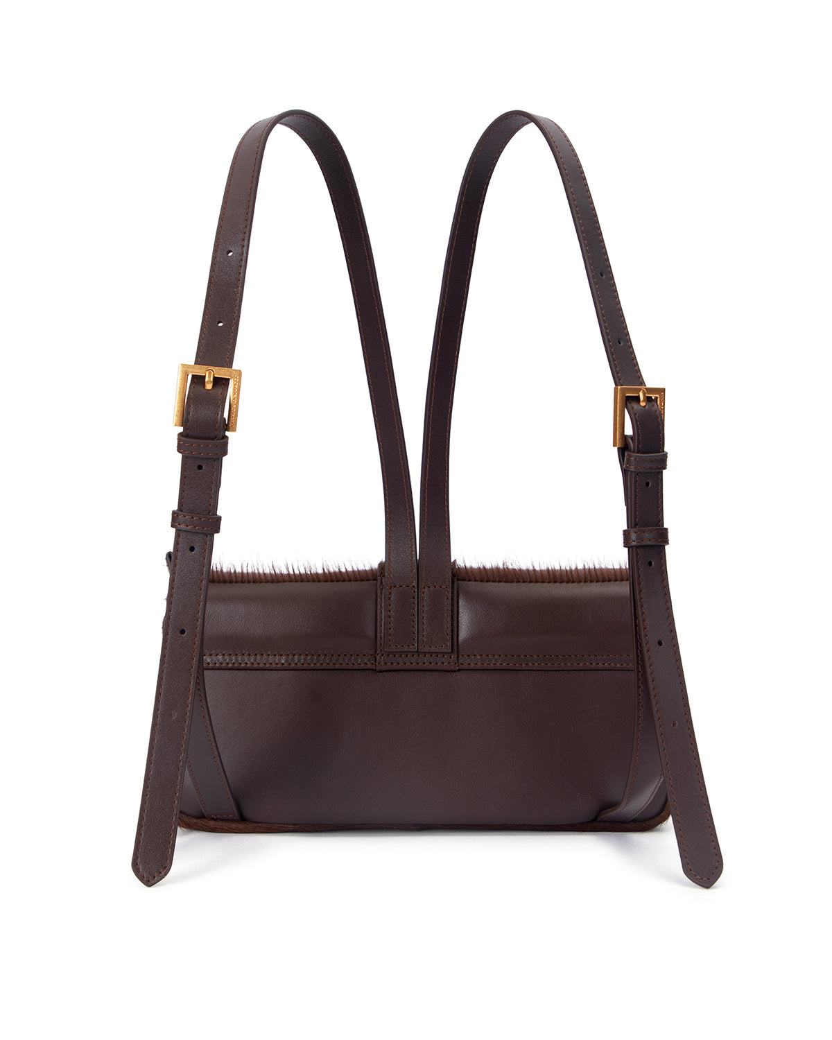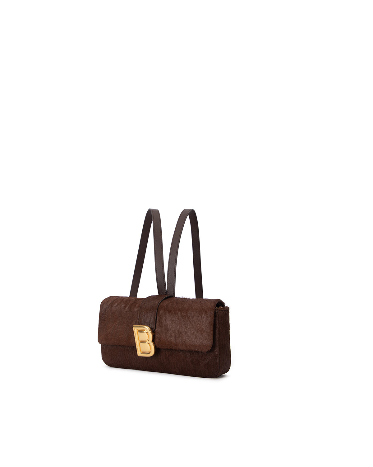 Warm texture meets striking design. The Nia Backpack in Brown Ponyhair features a plush, dimensional exterior paired with polished gold hardware. With its structured body, dual straps, and signature “B” closure, it offers an elevated, fashion-forward take on the classic backpack.